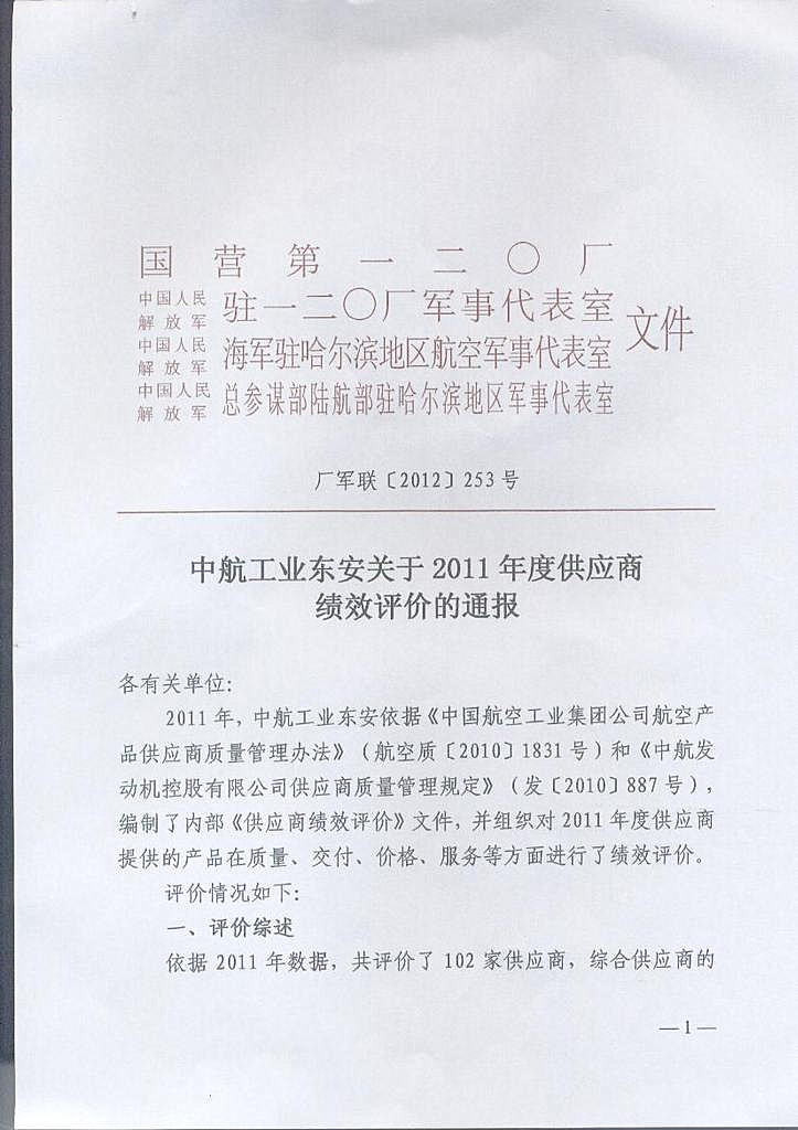 因高溫密封膠產(chǎn)品榮獲國營二0廠(中航工業(yè)東安發(fā)動機集團公司)2011年度優(yōu)秀供應(yīng)商稱號 |